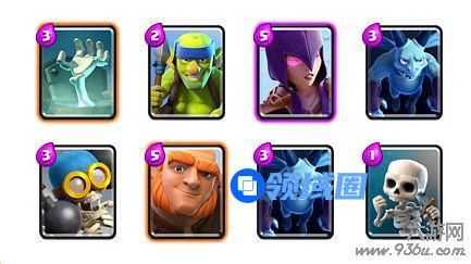 哥布林投矛、骷髅兵以及炸弹人:它们是同一类的,人海流就是要靠数量堆起来,哥布林和炸弹人的远程输出,以及骷髅兵近战。如果敌方不出兵抵挡,可以推塔无阻。