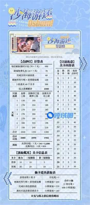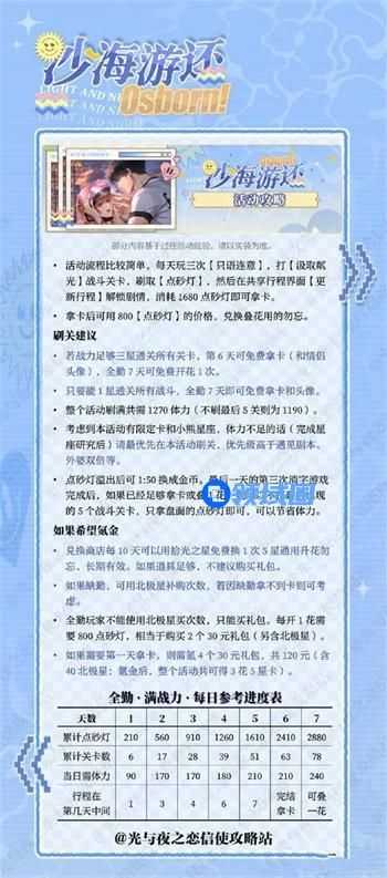 1.活动流程比较简单,每天玩三次只语连意,打汲取粼光战斗关卡,刷取点砂灯,然后在共享行程界面更新行程解锁剧情,消耗1680点砂灯即可拿卡。
