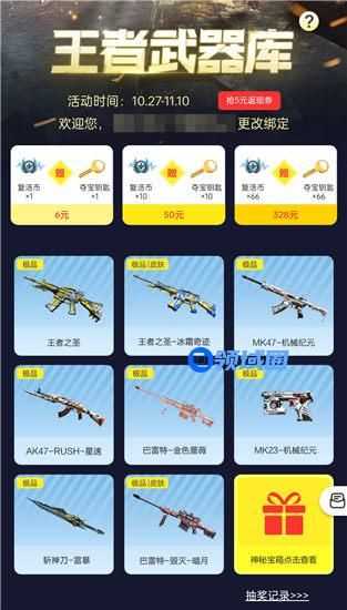 此次活动在道聚城中举办,大家可以在道聚城中穿越火线:枪战王者专区进入活动。王者武器库的活动时间为10.27~11.10,活动期间大家可以6元购买1个复活币附赠1个夺宝钥匙,另外还有50元10个的档位和328元66个的档位,大家可以根据需求进行购买。