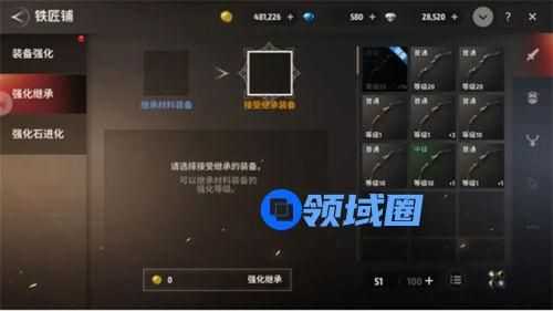 强化继承位于【菜单】-【成长】-【铁匠铺】中,先选中想要转移属性的装备,再选中接收属性的装备,点击下方【强化继承】按钮即可进行强化。