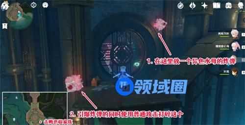 位于下图所示位置墙壁上,先在右上角小小恶棍旁边放置「异色水母」的炸弹,之后自己靠近左下角这个,在按E引爆炸弹的同时自身通过普通攻击打破另一个,即可将它们同时击破,使此处排水口恢复。