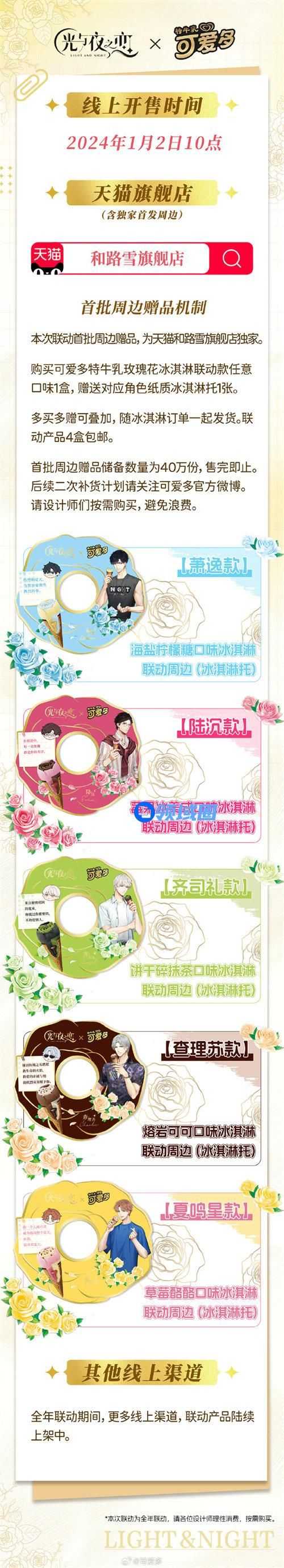 可爱多特牛乳 x @光与夜之恋 2024全年联动,即将开启。五位男主携5款专属定制口味冰淇淋,续写甜蜜爱恋;独特玫瑰造型,叩动浪漫心弦。