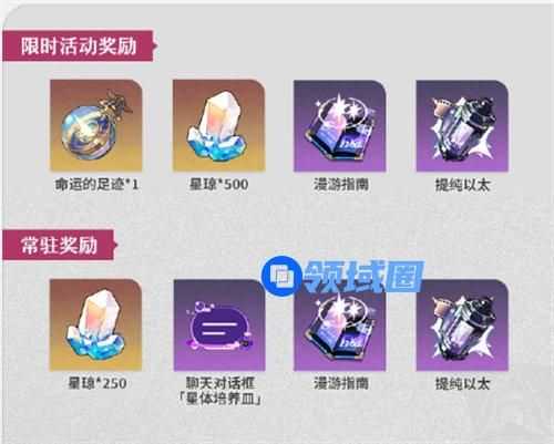 活动期间参与活动,开拓者共计可获得命运的足迹*1、星琼*750、聊天对话框「星体培养皿」等奖励。