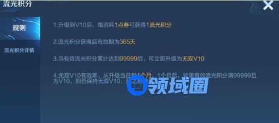 4.无双V10有效期,从升级当日起1个月: 1个月后,如果有效流光积分满9999且为V10,则仍保持无双V10,反之则降级。