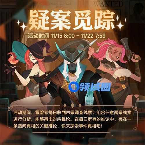活动期间,冒险者每曰收到四条调查线索,组合任意两条线索进行分析,能够得出对应推论。在每日所有的推论中,存在一条指向真相的关键推论,快来探索事件真相吧!