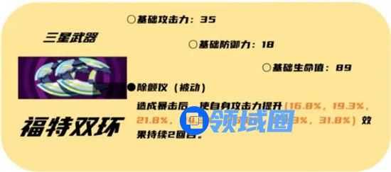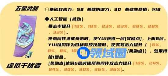 YUI专武五星武器,暴击率加成和队伍暴击即可触发的[奖励点]层数,更是可以额外给队友增加攻击力,[奖励点]层数满后更是有全队攻击加成,配合高暴击队伍,可以更好的累计层数。