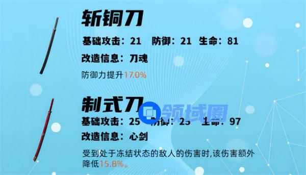 如果队伍搭配可以使敌人一直处于冻结状态,制式刀则优于斩铜刀。反之队伍搭配对冻结状态的优先级不高的话,则斩铜刀优于制式刀
