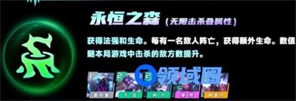 永恒之森棋子们获得法强与生命值加成,生命值加成取决于土壤层数。每有一个敌方英雄死亡时,获得一层土壤层数。