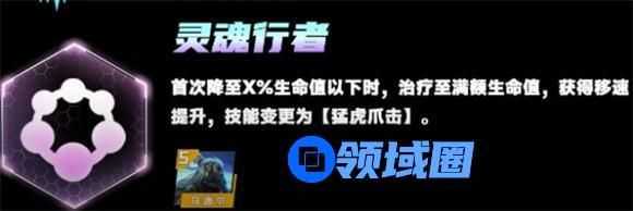 当灵魂行者的生命值第一次低于50%时,会释放体内的怒火,治疗至满额生命值,获得移动速度提升,并将技能从蛮羊冲击变更为猛虎爪击。