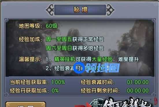 值得注意的是,玩家每日进入秘境场景中前一小时获取正常挂机经验,超出一小时后获取经验将会随挂机时间适量减少(周末获取双倍经验)。并且秘境场景内允许玩家使用经验丹来增加挂机所获得经验,使用经验丹后经验获取将在当前基础经验上额外增加。此外秘境场景内玩家PK模式自动切换为和平模式,同时场景内支持玩家组队挂机,而当玩家处于组队状态下进入秘境,选择精英难度挑战将与大于自己等级5级选择普通难度的玩家进入同一场景(如:同一队伍中的65级玩家和70级玩家,65级玩家选择精英难度,70玩家选择普通难度,则两者进入同一场景)。