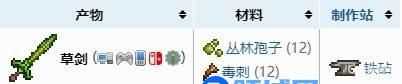合成草剑需要丛林孢子和毒刺各12个,集齐材料后在铁砧或者铅砧处合成装备。PS:如果在困难模式中为草剑收集制作材料,刷毒刺会变得难得多,因为会掉落它的黄蜂和尖刺丛林史莱姆会较少生成。在困难模式期间变得更常见的敌怪是不会掉落毒刺的苔藓黄蜂。