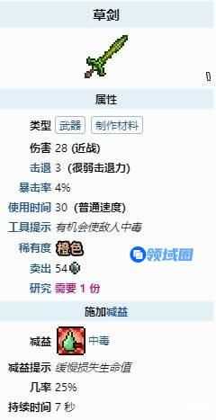 草剑是一把长度略长于炽焰巨剑并有普通攻击速度的阔剑。它在挥舞时有类似于叶子的绿色粒子效果,并有 25%几率造成中毒减益。它是制作永夜刃的关键材料之一。