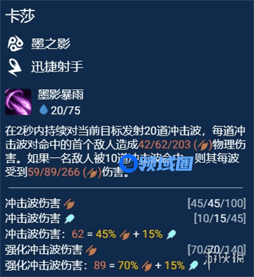 墨影暴雨20/75在2秒内持续对当前目标发射20道冲击波,每道冲击波对命中的首个敌人造成42/62/203 物理伤害。如果一名敌人被10道冲击波命中,则其每波受到59/89/266伤害。艾克西亚毛毛雨单体加强版