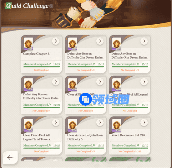 1. 公会挑战由一系列团队任务组成。只有达到一定数量的公会成员共同满足要求后,您才能领取奖励。