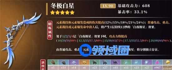 第二个推荐的武器是冬极白星,在满级的情况下基础攻击力为六百。装备后即可提高百分之二十四的元素战技与爆发伤害。当玩家使用普攻、重击等命中敌人后,还会拥有攻击力的增益加成,持续时间为十二秒钟。虽然该武器是别的角色的专武,但是技能特效也完美的符合甘雨。在精炼一阶的情况下,就能够让角色吃到百分之三十的攻击加成,中间衔接普攻还能触发百分之四十八的攻击加成。该武器比较适合选择融化流阵容的甘雨,理想上造成更高的伤害。目前融化流的常见搭配是香菱、班尼特加上甘雨,前两者都需要贴脸释放攻击,配合武器恰好可让甘雨触发近战加成效果。