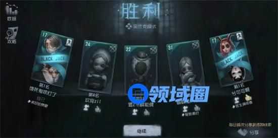 在黑杰克模式当中,玩家的获胜条件不是逃出庄园,也不是击败其他对手,而是凑卡牌点数,只有最后自己获得的卡牌点数等于21时,才能取得最终的胜利。游戏开始之前,玩家可以自由选择一名求生者和监管者,由于模式的限制,有些求生者的技能会改变,优先选择技能前置强势的角色,比如说古董商,大副,拉拉队员,由于每一个回合,道具数量都会刷新,所以无脑使用即可。而监管者最好选择一些0阶就能强力追击能力的监管,由于我们自带一刀斩的效果,所以红蝶,守夜人,歌剧演员这种强势的追击屠夫会异常的好用。而像噩梦,杰克,厂长这种不开二阶,追击效率极低的监管者,就尽量不要选择,免得开局就落入劣势。