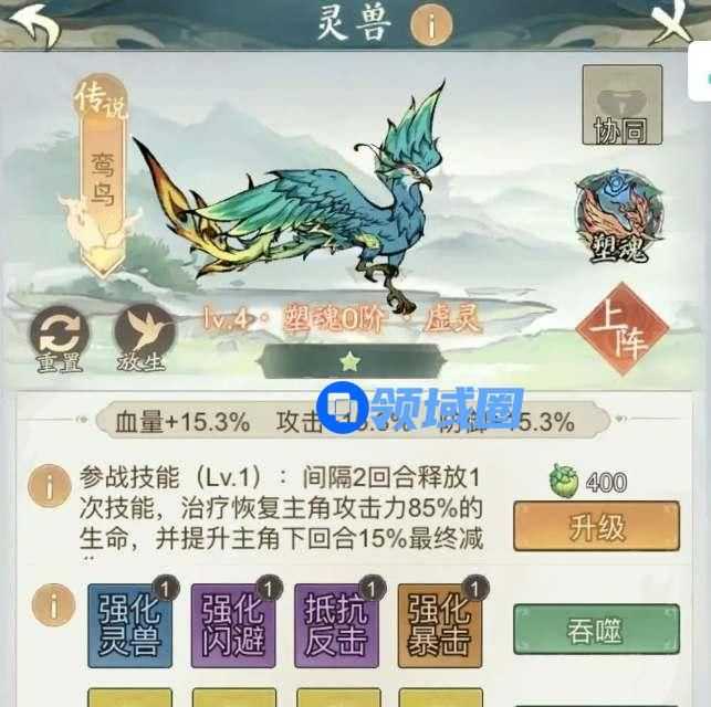 3、协同灵兽优先选择青龙,一回合一次的攻击频率可以提升输出能力。也可以选择鸾鸟或玄武这类带有治疗和增益效果的灵兽。
