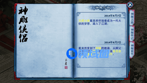 神雕侠侣游戏是一个世界,在这样一个世界观下,我们每一个玩家,每一个角色都是这个游戏,这个故事的一份子,我们的神雕之路功能就是玩家自己的故事记录,玩家可以在这里面看到自己经历的点点滴滴,书写自己的快意恩仇!
