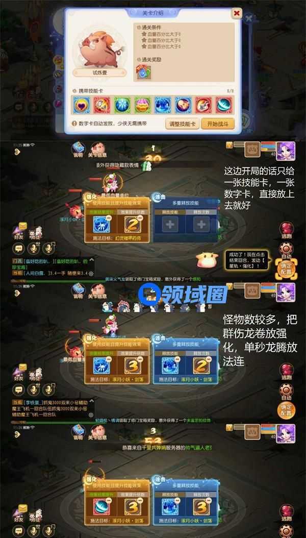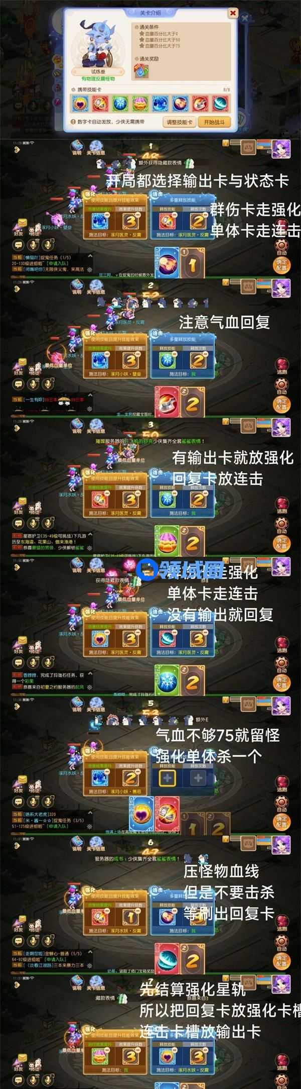 5.开局首回合状态卡优先放右侧连击星轨,高数字卡与输出卡放左侧,多怪时群体输出卡优先放左侧强化星轨,选择高数字卡,收尾回血时气血回复卡优先放左侧强化星轨。