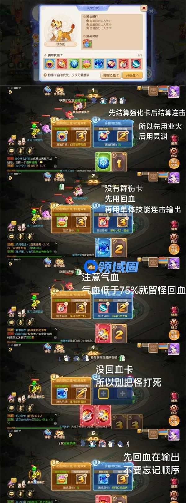 4.试炼贰和试炼叁对于三星通关的条件都是气血高于75%,所以最后我们一定要注意气血比,收尾阶段如果气血低的话可以等刷出气血回复卡再进行最后的击杀。