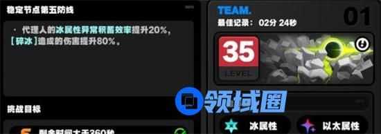 效果为:代理人的冰属性异常积蓄效率提升20%,[碎冰]的伤害提升80%,此时我们只需要练一个队伍,可以配队为一击破一辅助;{如防护,异常,支援等}一强攻,击破四星可以用安比,五星可以选择珂蕾妲,莱卡恩;