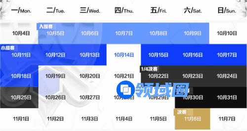 简单来说赛程还是和以往一样,一个月的时间,入围赛是5天;小组赛持续8天,中间10月14日休息一天;接着就是1/4决赛,持续4天;