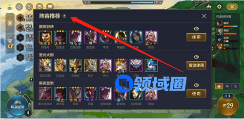 1、如上图所示,进入对局游戏后,点击右上角的左边第一个标志就可以查看阵容推荐了,然后根据自己需要就直接使用阵容推荐了。