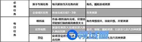 总结:必做任务有新手专属任务,企业成长任务;每日必做的就有模拟战,世界地图,圣凯。