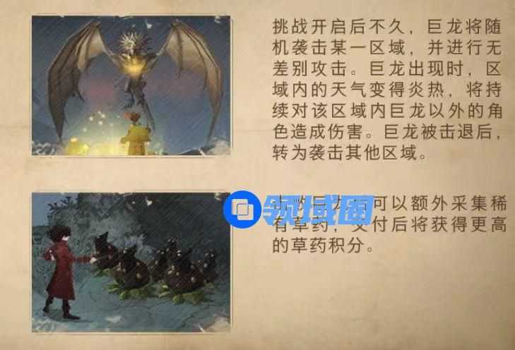 挑战开启后,巨龙会随机攻击一个区域内的玩家,在巨龙袭击区域的玩家会受到持续伤害,击退巨龙后,可以额外采集稀有草药,交付稀有草药会获得更多草药积分。