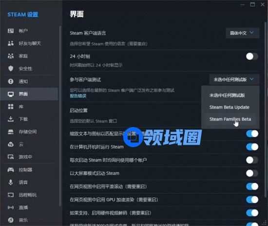 答:打开steam-设置-界面-客户端测试-最下面的家庭测试即可
