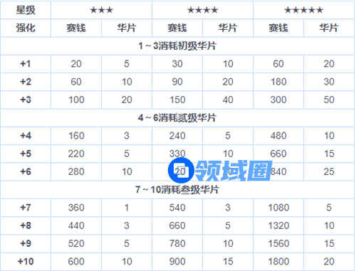 3星强化+10需要消耗共计:2760塞钱、初级华片*35、二级华片*18、三级华片*19