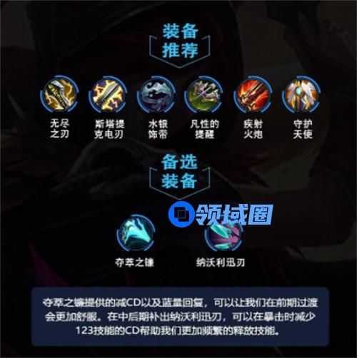 综上所述,霞需要攻击力、攻速、暴击率以及一定的自保能力。所以前中期,电刀无尽火炮视场上形式和具体情况来出;中后期团战做大轻语来破甲,出复活甲来保命。