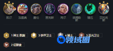 首先我们要确定阵容英雄的选择,英雄选择分别是凯尔,加里奥,盖伦,贾克斯,芮尔,泰坦,剑魔。组成羁绊为神王,三铁甲,四骑士,三圣光,两征服