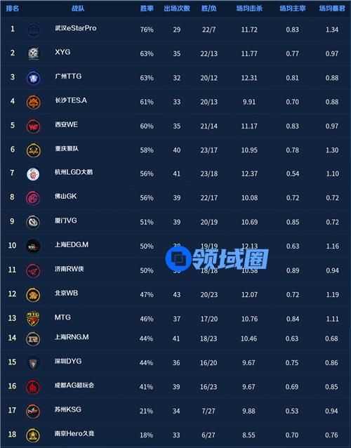 目前胜率最高的是武汉eStarPro,稳居第一位,进季后赛是板上钉钉的事情。紧随其后的就是XYG、广州TTG和长沙TES.A,这几个都是很有希望进季后赛的。