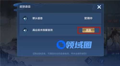 然后定制功能的右边会有一个【语音】的按钮,点击后会弹出一个切换技能音效的窗口,选中另一个技能音效就行了。(PS:需要先拥有高山流水皮肤后,才会出现音效的功能按钮。)