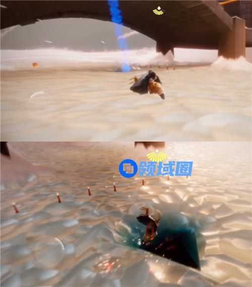 首先蓝色光芒在【霞谷地图的溜冰场】,蓝色光芒会在溜冰场上方盘旋,大部分时间会钻入冰层下面的水里盘旋,如果你在上空没看到蓝色光芒,那就要从这个洞进入冰层下面寻找了。
