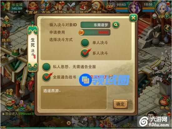 三、输入决斗对象ID,选择决斗方式,最后选择【确定】,战斗下达之后,你需要等待对方响应你的决斗。