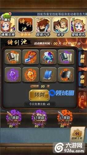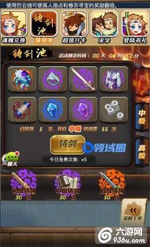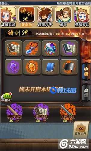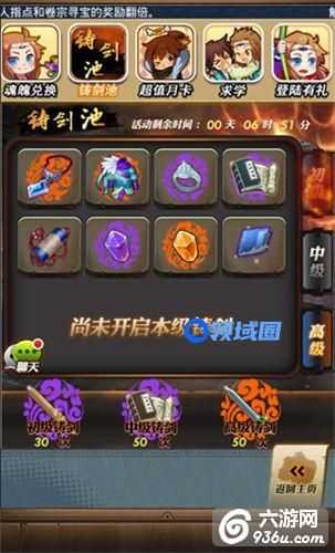 铸剑池分为初级、中级与高级三种。其是加速装备升锻的宝地,里面有装备锻造所需要的锻造石、橙装、紫装等。另初级铸剑30次可获得紫武木剑,中级铸剑50次可获得紫书刺客列传,高级铸剑50次可获得橙武天问。