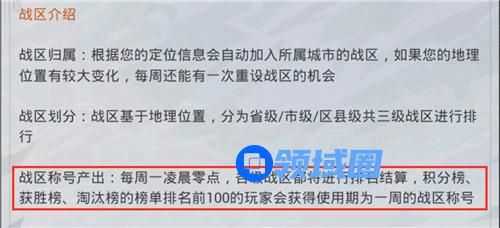 然后我们点击右上角的问号,点开我们往下滑可以看到称号获取方法,上面写的很清楚战区称号每周一会产出,并且是各个榜单的前100名玩家才能够获得。