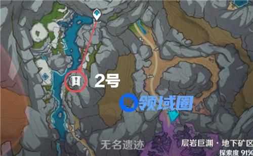 2号化石:无名遗迹上方传送点,往下走,在河道边三个丘丘人后。