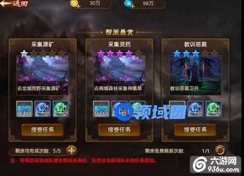 悬赏任务分1-5星,五个星级,星级越高,奖励越好,任务星级可使用刷新功能刷新。玩家每日可获得五次免费完成次数并可额外购买完成次数,可购买次数多少由VIP等级决定。