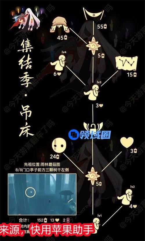 头巾先祖兑换道具:拒绝动作lv1-lv4,头巾发型,爱心,面具等。一共需要152个蜡烛,13颗爱心,2个红蜡烛。