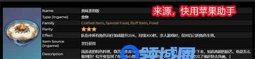 料理效果:队伍中所有角色治疗加成提升25%,持续300秒。多人游戏时,仅对自己的角色生效。