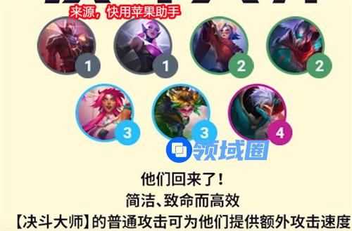 云顶之弈s8赛季已经在测试服上线了,并且在新版本的羁绊当中我们的老朋友决斗大师羁绊也是回来了,但并不是完全回来有了一些改动。那么新版的决斗大师羁绊效果是什么呢?接下来和小编一起看看吧。
