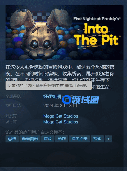 《玩具熊的五夜惊魂》的新作《玩具熊的五夜后宫:陷入深渊》已经于8月8日登陆Steam平台,而截至目前,本作获得了好评如潮的评价,2283条用户评论中,好评率高达96%。