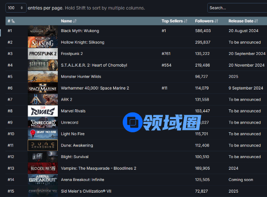 与此同时,《黑神话:悟空》也牢牢占据着Steam愿望榜单的第一名,游戏关注人数多达58万6403人。