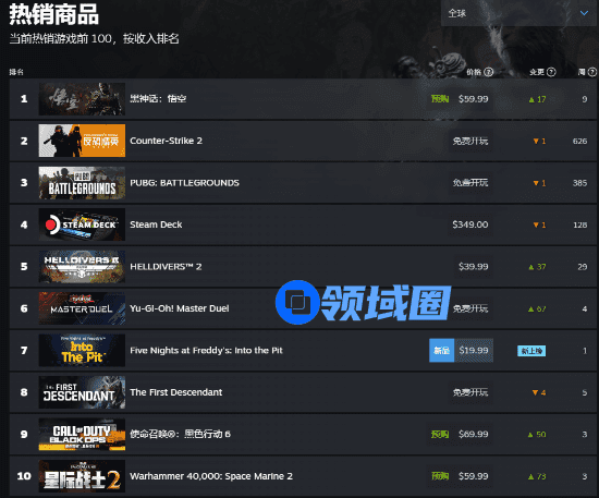 据Steam商店显示,游戏最新预告发布后,《黑神话:悟空》销量较上周上涨了17名,登顶全球热销榜(按收入排名)第一名,超过了《CS2》《绝地求生》等免费游戏,以及多年上榜Steam Deck掌机。