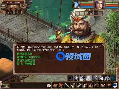 六、玩家进入游戏到长安(315,95)找“阿由葛保常”,即可取出在“藏宝阁”购买成功的物品。由于藏宝阁页面和游戏内信息之间有所延迟,所以玩家在藏宝阁购买的东西需要略等15分钟左右才可以在游戏内看到。