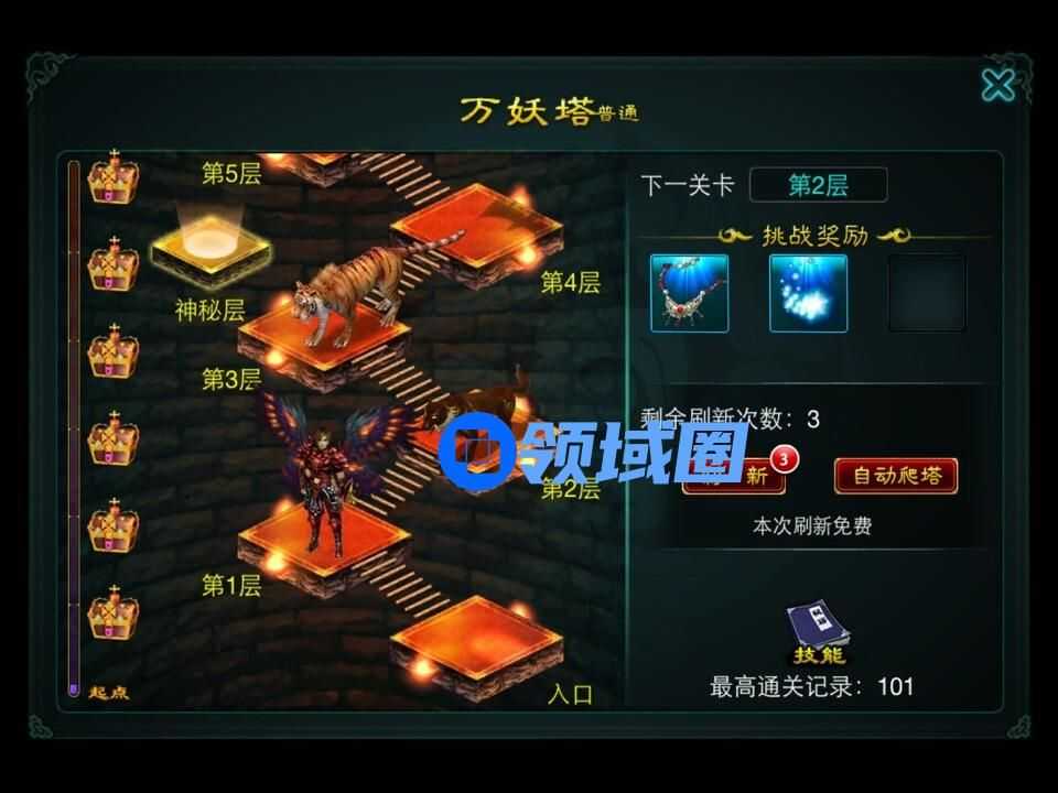 当玩家开启万妖塔之后可点击挑战中的万妖塔进入,万妖塔由3个难度6个大层30个小层组成,万妖塔每10层会获得特殊宝箱,通关一个难度之后会开启 下一个难度,是玩家在游戏中获得星尘,聚星宝石,神翼白羽的重要产出点。万妖塔每天有刷新机会(根据VIP等级不同有不同),刷新后可使用自动爬楼,将之 前楼层的东西重新获得一遍。