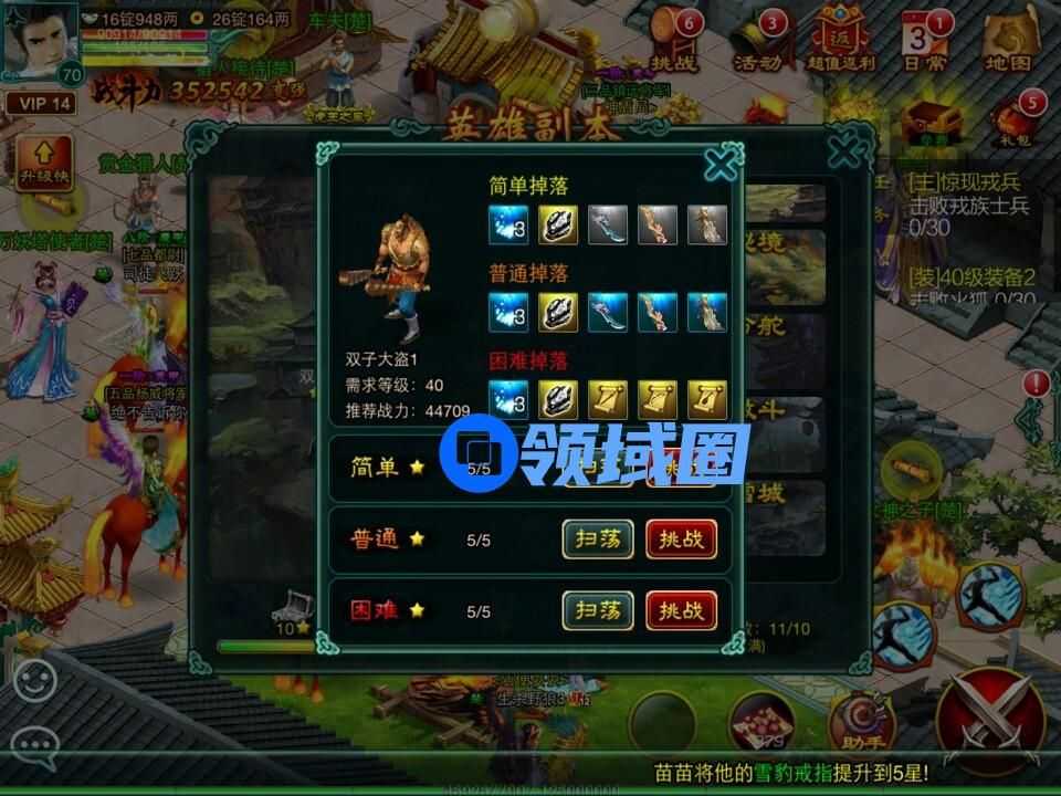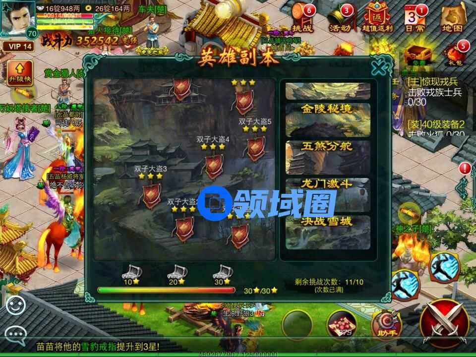玩家通过主界面的“挑战”可快速链接到英雄本的挑战界面,英雄本有不同的星数区分,最高3星,分别对应3种不同的难度。同时多人本也是饰品、装备、 经脉升级所需星数等重要产出途径,是十分重要的一个玩法,同一个副本每个难度每天最多可挑战5次,可用扫荡令直接完成,英雄本的挑战次数可通过英雄令进行增加。